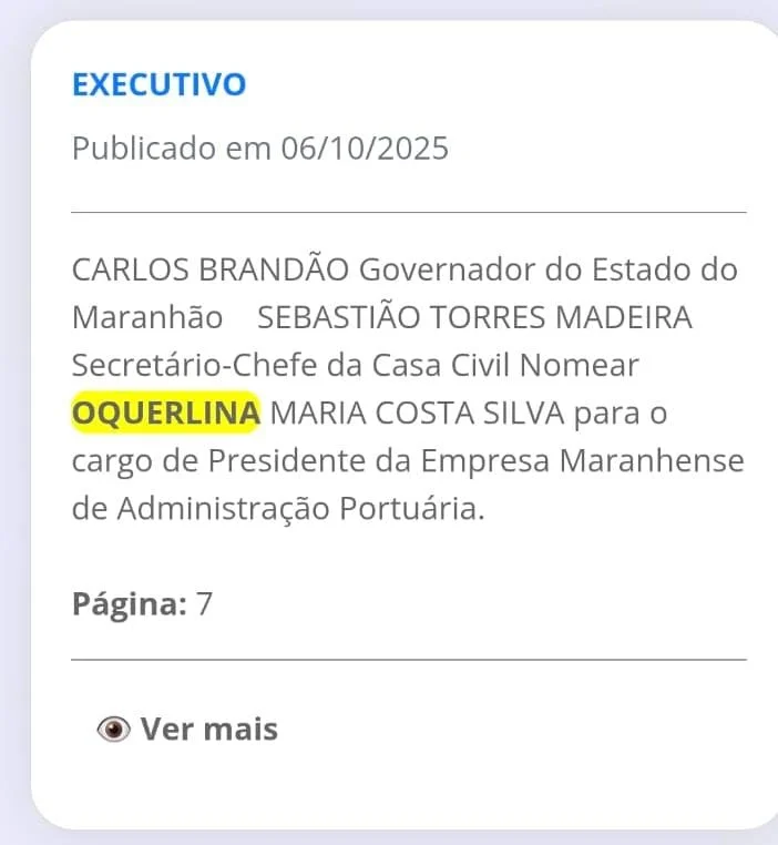 O governador Carlos Brandão nomeou Oquerlina Maria Costa e Silva para a presidência da Empresa Maranhense de Administração Portuária (EMAP), que administra o Porto do Itaqui. O ato de nomeação foi publicado na edição desta segunda-feira (6), do Diário Oficial.