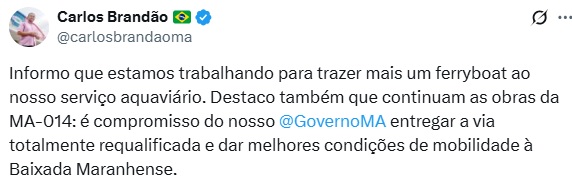 “Informo que estamos trabalhando para trazer mais um ferryboat ao nosso serviço aquaviário. Destaco também que continuam as obras da MA-014: é compromisso do nosso Governo do Maranhão entregar a via totalmente requalificada e dar melhores condições de mobilidade à Baixada Maranhense”, assegurou.