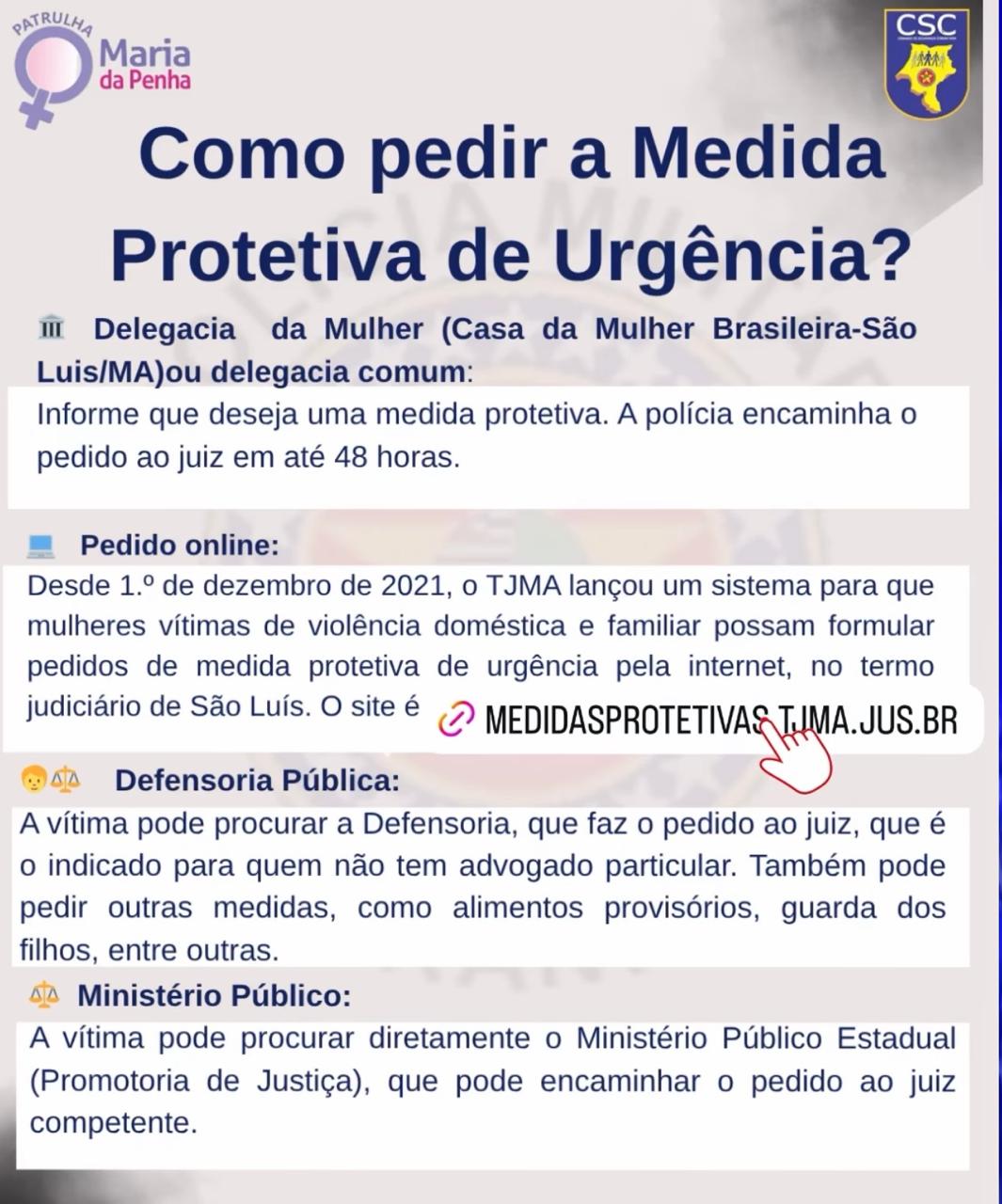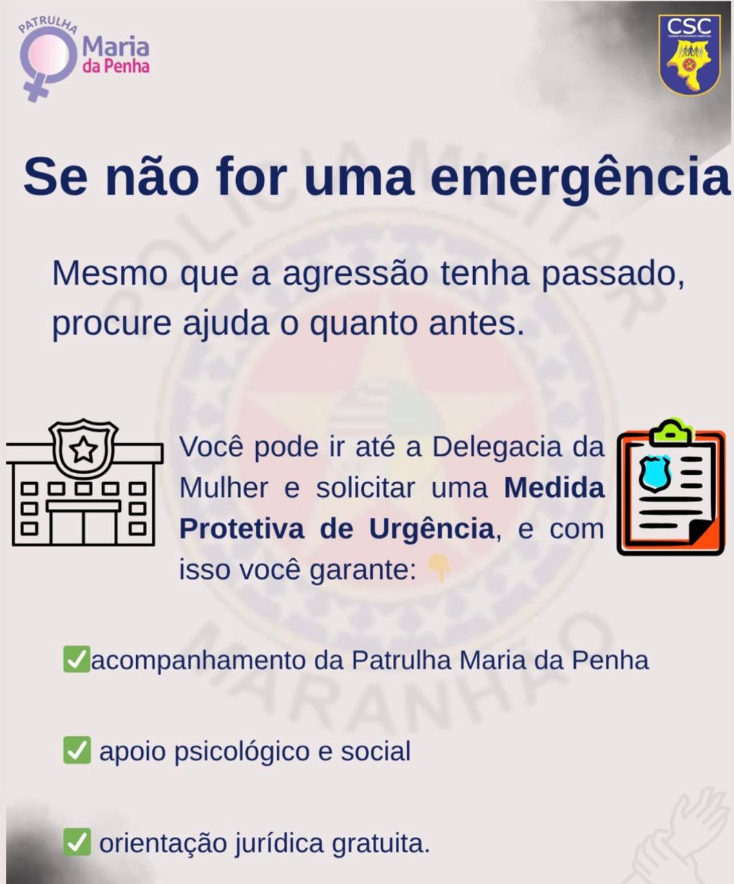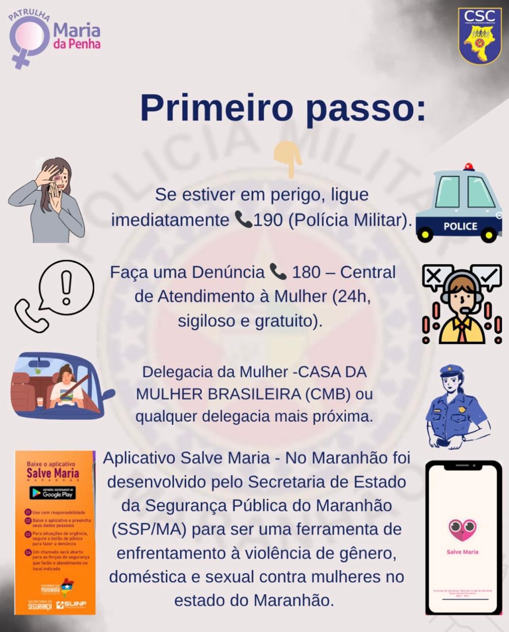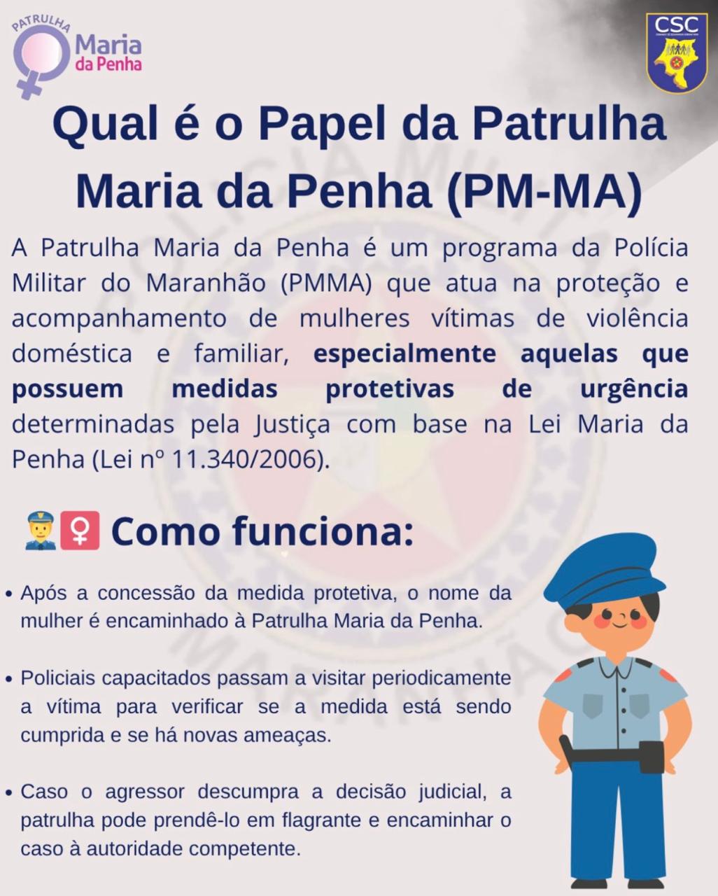 A Patrulha Maria da Penha é um programa da Polícia Militar do Maranhão que fiscaliza o cumprimento de medidas protetivas de urgência e presta apoio a mulheres vítimas de violência doméstica e familiar. Para buscar ajuda, as denúncias podem ser feitas pelo Disque-Denúncia